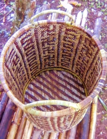 **Description:** This intricately woven basket showcases an organic design, characterized by its earthy tones and symmetrical patterns. Crafted from natural fibers, it features sturdy handles, making it perfect for carrying goods or as a decorative piece to enhance any space. The open design allows for ventilation, making it ideal for storing fruits or vegetables